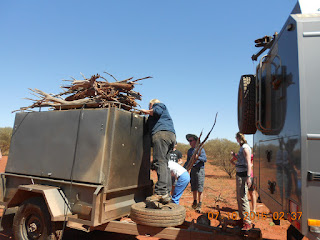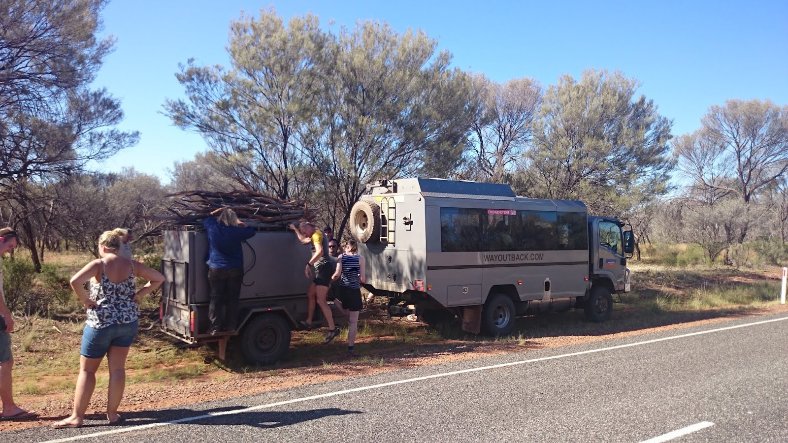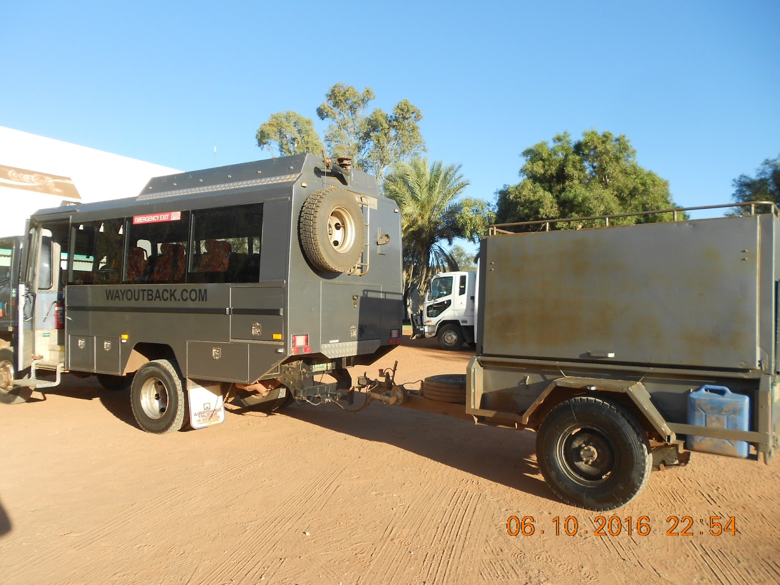Zentrum" Australiens beginnt früh um 6 Uhr. Wir nehmen Platz in einem Allrad-Bus, das Gepäck wird im Anhänger verstaut.