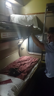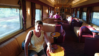 Unser Abteil (noch im Tageslayout) mit Bad, die Lounge mit u.a. 8 Sorten Bier, der Speisewagen mit 3-Gang-Menü. In der Zwischenzeit wurde das Abteil für