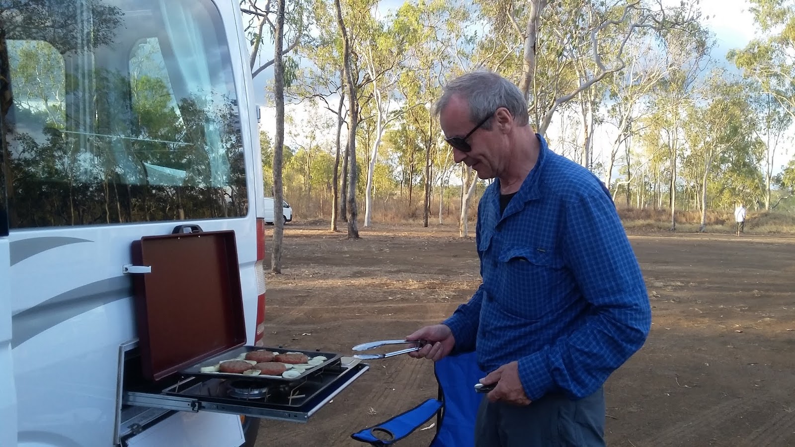 es noch ca. eine Stunde hell ist, wollen wir noch den am Fahrzeug angebauten Gasgrill ausprobieren. Es klappt mit im Supermarkt gekauften Burgern und der