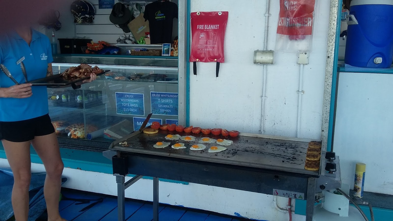 Uhr gab es Frühstück : Full cooked breakfast. Also gebratene Eier, Schinken und Kartoffelpuffer, dazu noch Toast, Butter und Marmelade (Vegemite natürlich