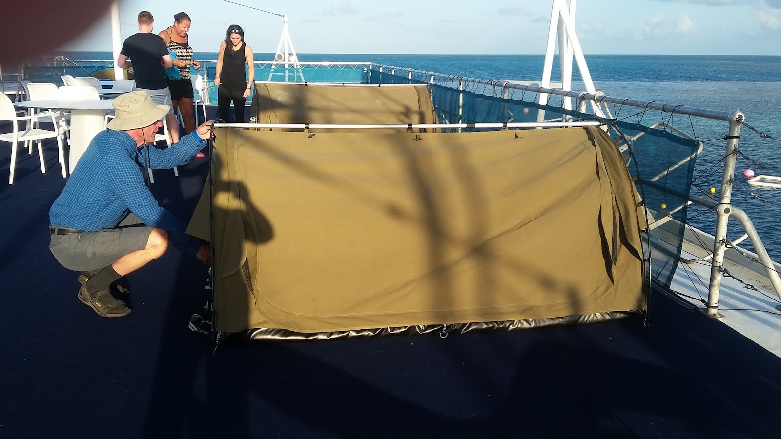 hatte die Besatzung auch unsere Zelte auf dem Oberdeck aufgebaut, die wir noch im Hellen bezogen. Es waren also richtige Zelte und nicht die im Prospekt