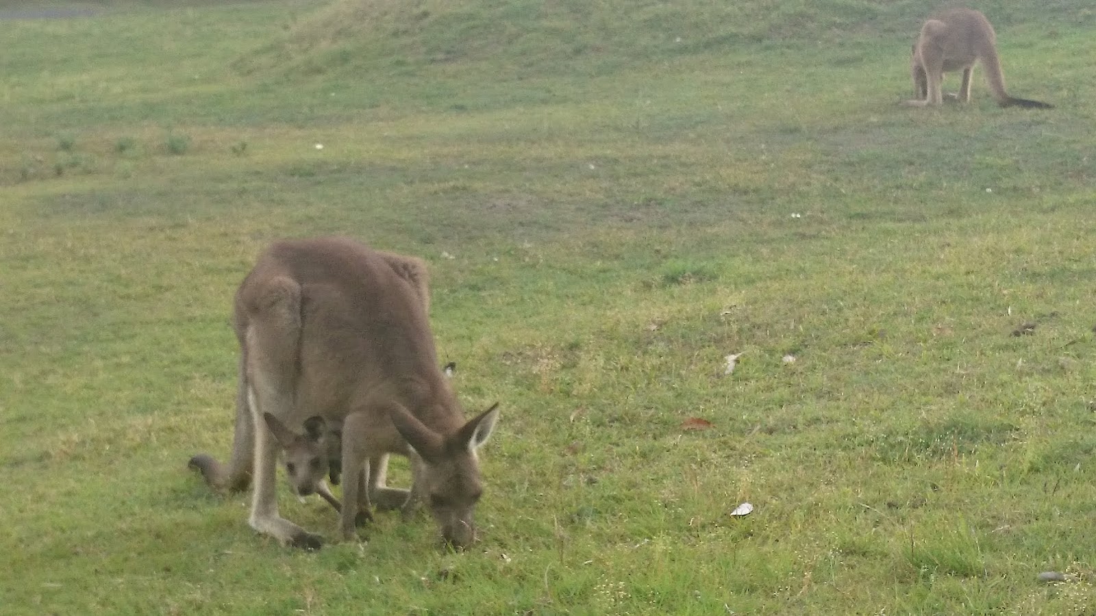 sehen wir auf einer Wiese die bisher unbekümmertsten Kängeruhs. Die Kleinen im Beutel sind schon relativ groß und grasen fleißig mit.
