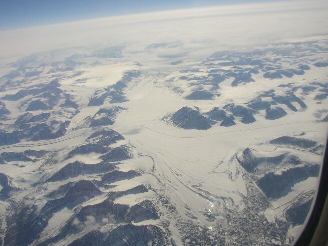 Das Küstengebirge mit seinen Gletschern ist faszinierend. Wir überfliegen eine Stunde lang eine Schneewüste ohne Konturen, ehe sich im Westen ein ähnliches Gebirge auftürmt. In abgeschwächter Form wiederholt sich dies auf Baffin Island. Wir überfliegen die Hudson Bay und erreichen bei Churchill das kanadische Festland. Alles ist noch in Schnee und Eis gehüllt. Zwischen Edmonton und Calgary dann wieder vertraute Bilder: die endlose Prärie.