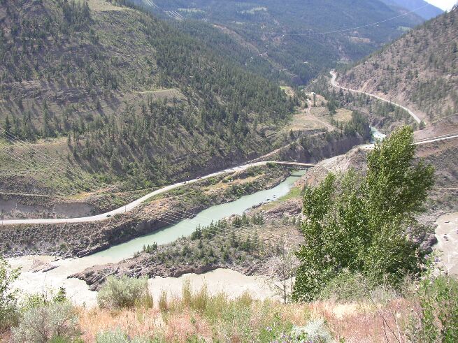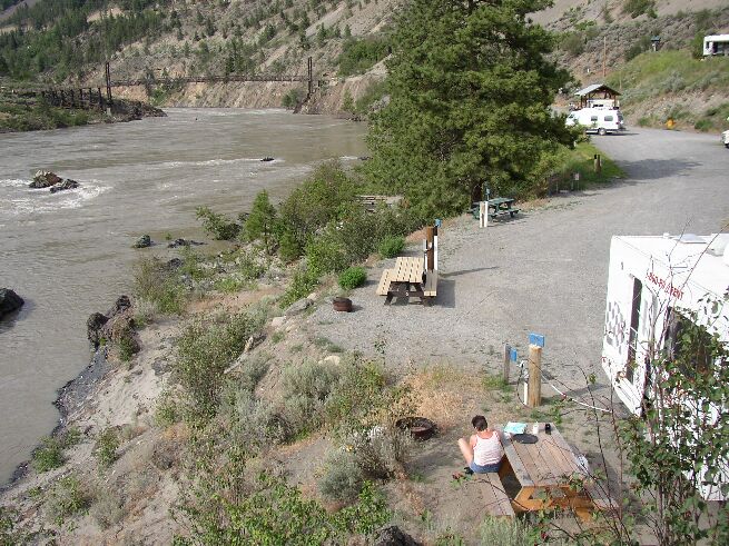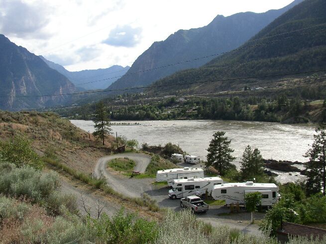 Mit einer rasanten Abfahrt ins Tal des Fraser River erreichen wir zur Kaffeezeit die Ortschaft Lillooet. Am Steilufer weist ein Campingplatz direkt in den Fluss hinein.