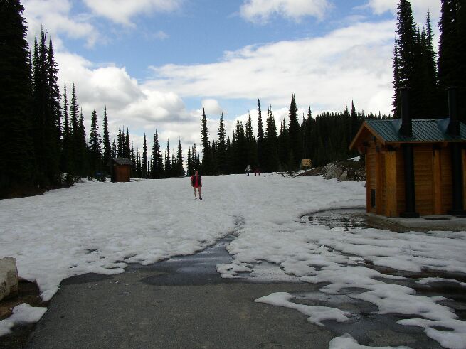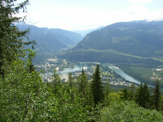 auf Revelstoke und die umliegenden Berge. Tatsächlich ist nach 22 km die Straße kommentarlos gesperrt. Einge RVs parken am Straßenrand, wir stellen uns dazu. Die zwei Kilometer bis zum offiziellen Parkplatz können wir auch laufen.