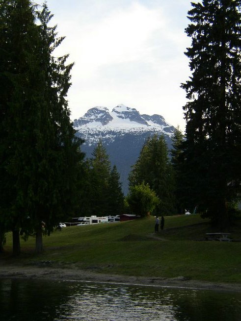 Kurz vor Revelstoke überqueren wir den Columbia River. Danach gibt es gleich einen Picknickplatz. Hier können wir Mittagspause machen und gleichzeitig einen Plan für den Nachmittag entwerfen. Weiter wollen wir heute nicht fahren. Es stehen mehrere Campingplätze zur Auswahl. Zunächst steuern wir den gleich um die Ecke gelegenen Lamplighter Campground an. Aber die Idylle in Text und Bild trügt, in Wirklichkeit ist er direkt neben der scheppernden Eisenbahnbrücke gelegen und der Eisenbahnverkehr ist auch hier recht rege.