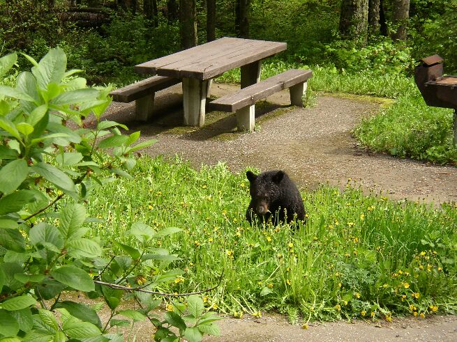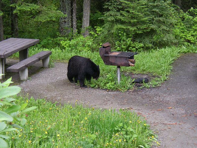 Inzwischen ist noch ein Auto angekommen. Die Frau meint: Keine Angst, es ist nur ein kleiner. Aber so richtig ran traut sie sich auch nicht. Es scheint tatsächlich ein junger Bär zu sein, unsere Anwesenheit beeindruckt ihn überhaupt nicht. Den Spaziergang zum Olive Lake schenken wir uns nun und fahren lieber weiter.