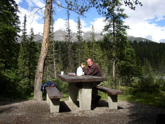 Hier schauen wir aber nur mal kurz vorbei. Unser Bedarf ist für heute gedeckt, obwohl auch dieses Bad sehr schön gelegen und auch noch etwas größer ist. Ebenfalls wird die ursprünglich hier geplante Übernachtung verworfen, wir fahren noch etwas weiter in den Kootenay National Park hinein. Hinter dem Sinclair Pass wollen wir einen kleinen Spaziergang zum Olive Lake machen und steuern zunächst den kleinen Picknickplatz an.