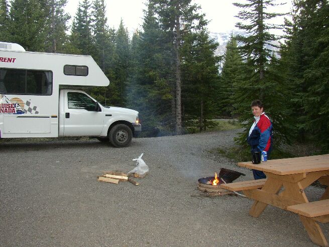 Meistens gibt es einen park facility operator, der abends mal mit einem Pick-up die Loops abfährt und nach dem Rechten schaut. Falls man kein Holz hat, kann man welches bei ihm kaufen. Da ist das fire permit gleich mit eingeschlossen, dass man in Alberta in jedem Fall haben muss. Selbst im Wald Holz zu sameln, ist verboten. Da wir neu waren, haben wir ein Bündel (ein Kubikfuss) für $6 gekauft, und da wir keine Axt hatten, wurde es uns auch noch gehackt. Danke, campground host Heller.