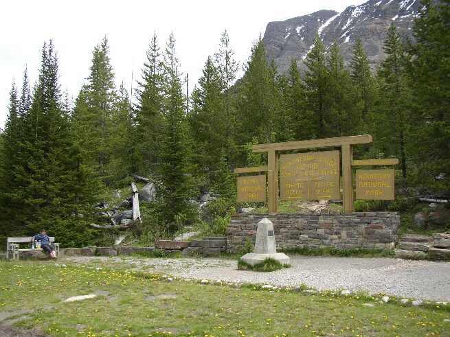 Rechtzeitig zur Mittagspause erreichen wir am Vermillion Pass gleich mehrere Grenzen: die kontinentale Wasserscheide, die Nationalparkgrenze zwischen Kootenay und Banff, die Provinzgrenze zwischen British Columbia (bye bye) und Alberta und die Zeitzonengrenze zwischen Pacific und Mountain Time. Letztere ist nicht ganz klar, es gibt wohl bezüglich der Sommerzeit einige Ausnahmeregelungen wie in den Indianergebieten am Grand Canyon und Monument Valley.