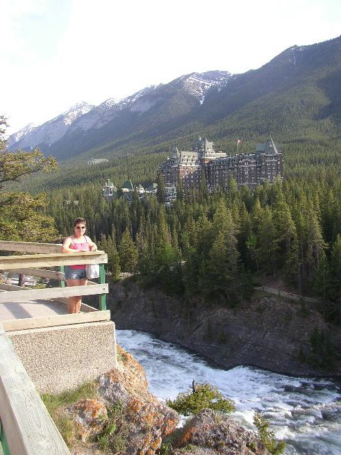 Damit begann der Tourismus in den kanadischen Rocky Mountains. Wir sind aber mehr wegen der Bow River Falls am Flussufer hierher gewandert. Das Foto können wir erst machen, nachdem eine grössere Gruppe Japaner die Plattform geräumt hat. Da muss man auch etwas Geduld haben, Japaner sind DigiCam-Perfektionisten.