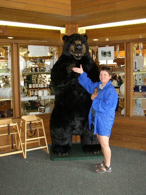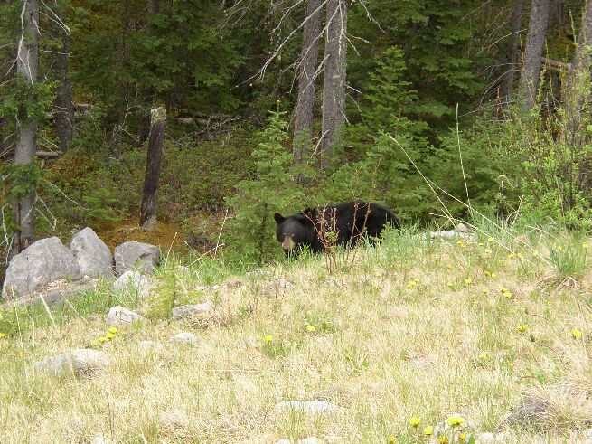Vor uns halten schon etwa 10 Fahrzeuge, auf der Gegenfahrbahn natürlich ein "japanischer" Reisebus. Die Kameras sind in Stellung gebracht. Es gibt doch einige Leute, die für diese Gelegenheiten riesige Teleobjektive und Stative mitschleppen, denn zu nahe ran sollte man wirklich nicht gehen. 100 m empfiehlt die Nationalparkverwaltung, das hält natürlich keiner ein. Als alle ihr Foto im Kasten haben, geht es langsam weiter. Im Info Center am Maligne Lake vertiefen wir das Erlebnis noch ein wenig.