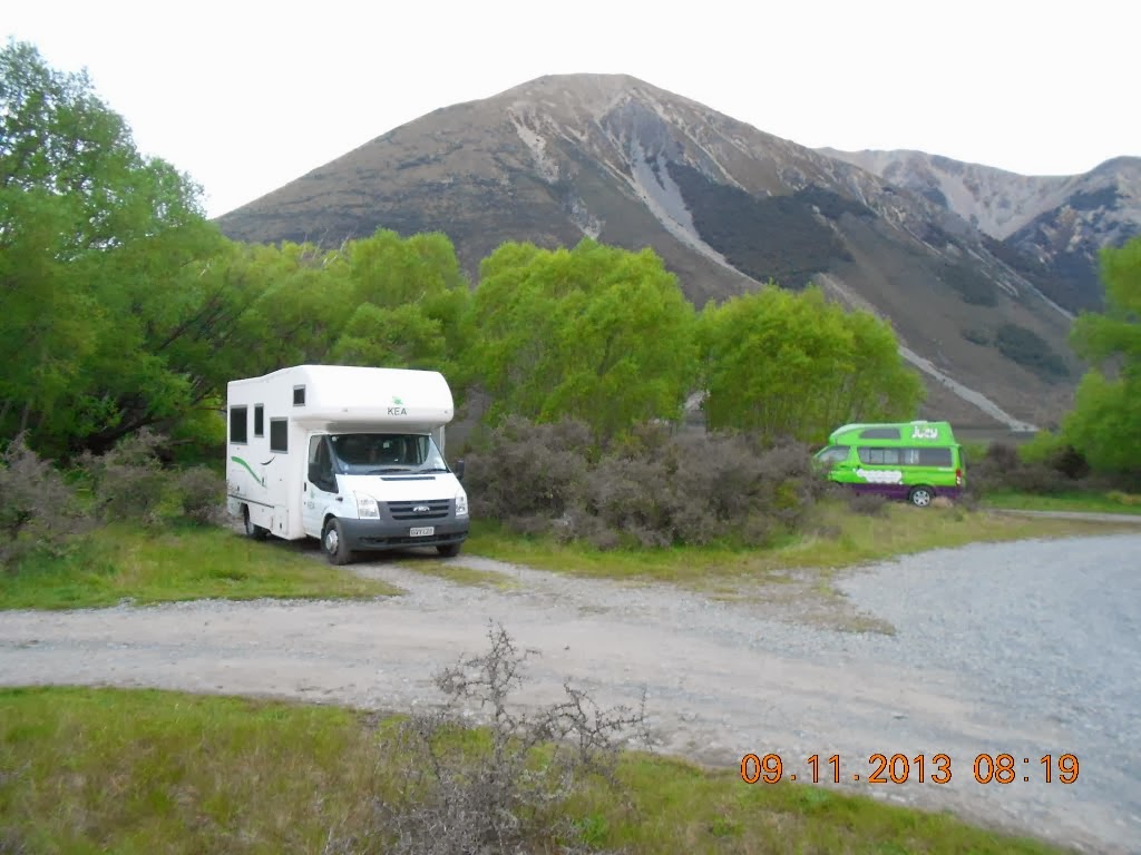 Am späten Nachmittag erreichen wir dann die Zufahrtstraße zum wohl schönsten Pass der neuseeländischen Alpen : Arthur Pass. Von der Ostseite ist er auch relativ leicht zu bewältigen wegen der langgestreckten, breiten Täler. War bis dahin das Wetter mehr oder weniger wolkenverhangen, so ändert sich das schlagartig nach Überwinden des ersten Voralpenpasses : die Sonne scheint. Und als wir dann am Lake Pearson, ca. 40 km vor dem Pass, einen schönen Stellplatz für die Nacht finden, können wir wieder einen schönen Tag bilanzieren.