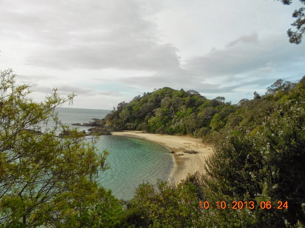 Tag 3, 10.10.2013, von Snells Beach, Warksworth, SH1, Whangarei nach Matapouri Bay, 120 km : Spaziergang um die Whangarei Falls, Wanderung über Strand und Klippen zur Whale Bay (aber keine Wale gesehen)