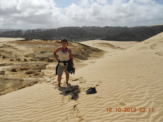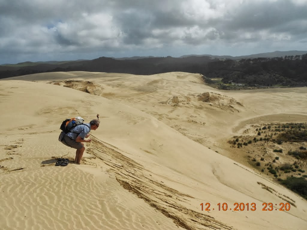 Tag 6, 13.10.2013 von Cape Reinga, SH1, Kaitaia, Ahipara, Rawene, SH12 zum Waipoua Forest, 233 km : Die Sanddünen von Te Paki. Sie ziehen sich kilometerweit am Strand hin, sind teilweise über 100 m hoch und teilweise recht steil. Man kann sich Sandboards ausleihen, das ist dann wie Schlittenfahren. Könner bringen da sicher auch mit Ski oder Snowboard was zustande.