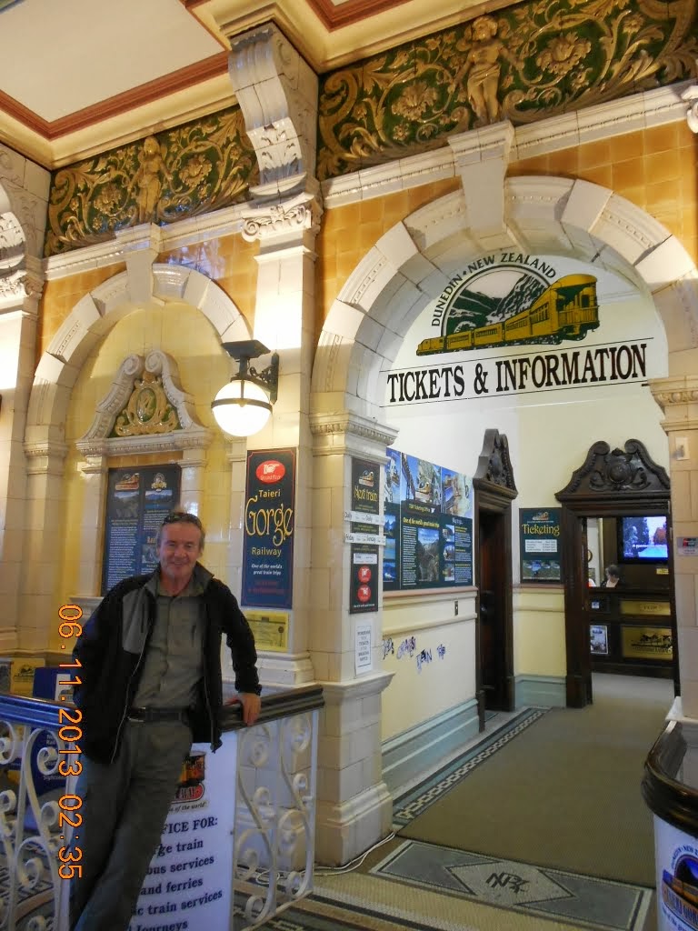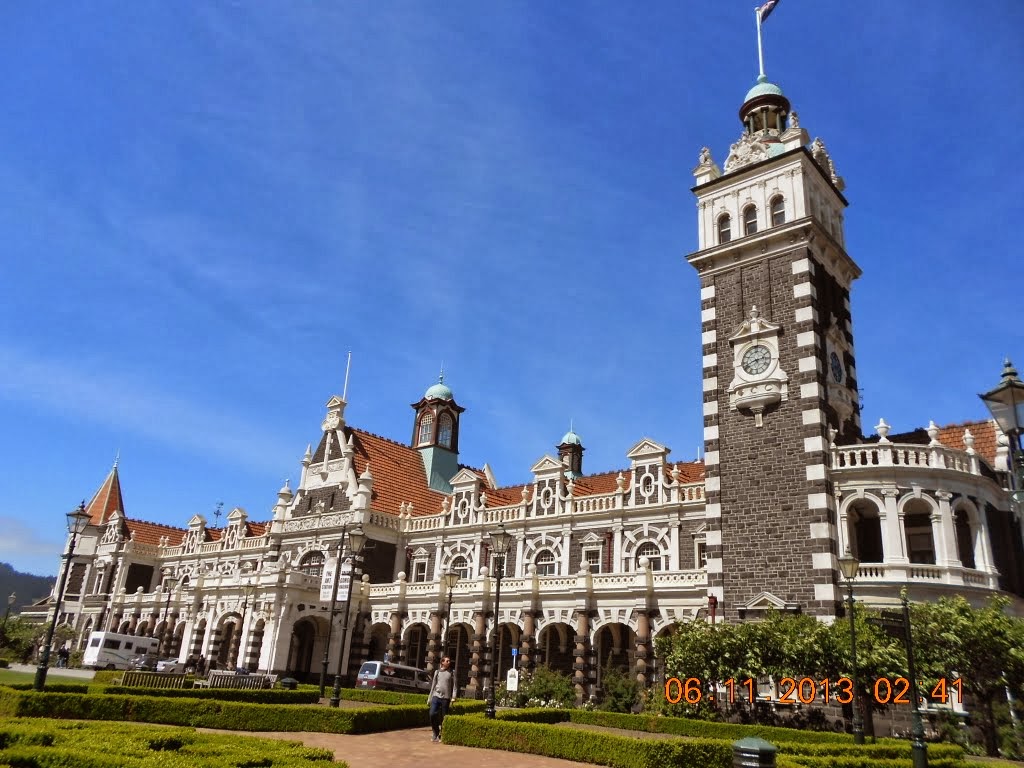 Dieser Tag lief nicht so gut. Erst wurde das Duschwasser nicht so richtig heiss, der Wind blies wohl die Flamme immer wieder aus. Dann ging es nach Dunedin, einer für neuseeländische Verhältnisse großen Stadt. Da fahren wir ja mit dem Wohnmobil nicht so gern rein. Diesmal wollten wir es nach den guten Erfahrungen in Invercargill wieder wagen. Der Reiseführer sprach auch von problemlosen Verkehrsverhältnissen. Das war wohl als Witz gemeint, denn allein an der Parkplatzsuche rieben wir uns auf. Erst nach einem Neustart nach der schönen Mittagspause etwas ausserhalb der Stadt klappte es noch so einigermassen. So konnten wir das Schmuckstück von Bahnhof besichtigen, der heute nur noch für eine Touristenbahn benutzt wird.