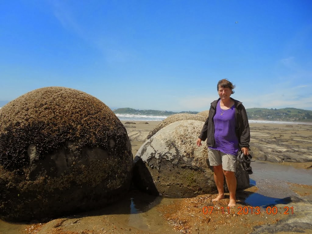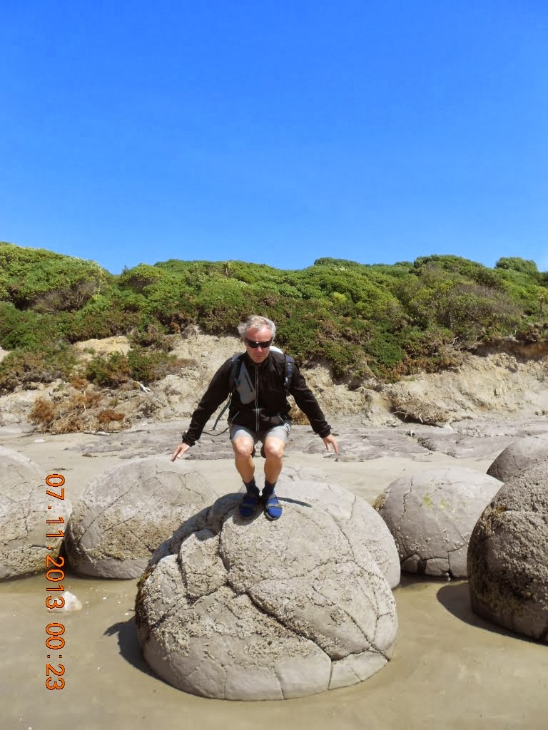Auch hier könnte man Pinguine beobachten, aber die Tageszeit passt nicht. Dafür besuchen wir noch eines der "Weltwunder" Neuseelands, die Moreaki Boulders. Große Kullern, die einfach so am Strand rumliegen. Es gibt natürlich eine wissenschaftliche Erklärung dafür.