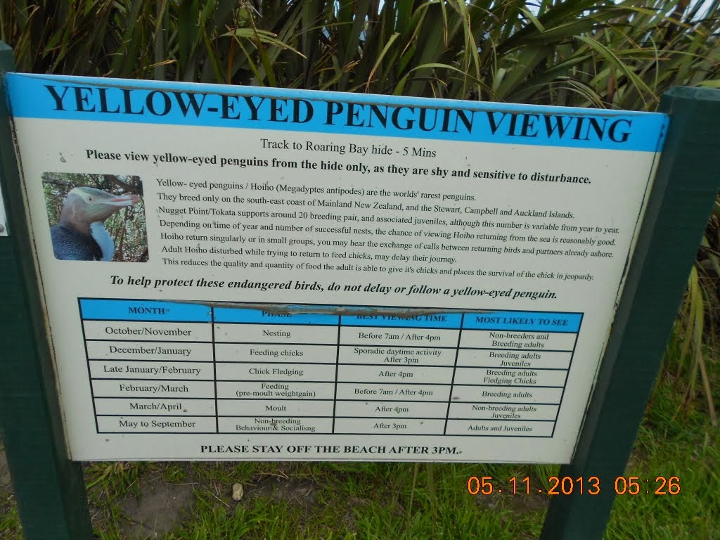 Mittlerweile ist es schon fast Kaffeezeit, da lesen wir, dass nach 16 Uhr in einer versteckten Bucht die Gelbaugenpinguine vom Fischen nach Hause kommen. Es gibt sogar eine Beobachtungshütte dafür. Tatsächlich dauert es bis nach 17 Uhr, bis ein! Pinguin angepaddelt kommt. Er nimmt Kontakt zum Weibchen im Nest auf und geht dann an Land. Da ist er aber sehr tolpatschig und muss sich auf dem steilen Abhang zur Brutstätte öfters ausruhen. Im Fernglas ist das alles gut zu beobachten, für Fotos braucht es ein gutes Teleobjektiv.