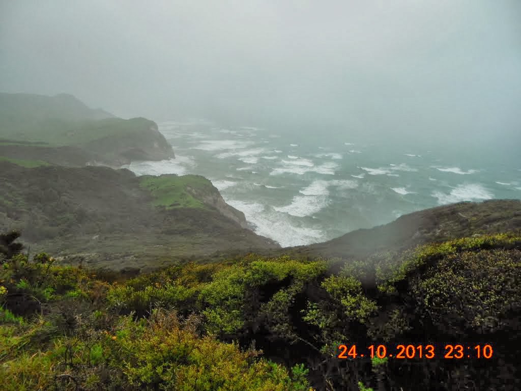 Tag 17, 24.10.2013 Von den Marlborough Sounds, SH6, Nelson, SH60 zur Golden Bay, 250 km : Früh hingen noch die Wolken des Nachtregens rum und es kündigte sich neuer Nachschub an.