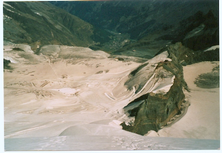 Der Blick hinunter über den Feegletscher nach Saas-Fee löst ein mulmiges Gefühl aus: Wer hier ausrutscht, spart zwar viel Zeit beim Rückweg, aber ob er sich dessen noch erfreuen kann, ist sehr fraglich.