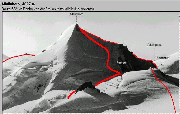 Jetzt wird es ernst: Ausrüstung anlegen (Steigeisen), anseilen (es gibt Gletscherspalten) und ab geht es etwa auf der dick rot gezeichneten Normalroute. Das Wetter ist prächtig, wir sind alle topfit. Schon nach einer Stunde erreichen wir das Feejoch.