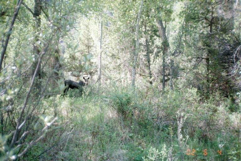Er lässt sich auch durch unsere Fotografierversuche nicht stören. Näher als etwa 10 m gehen wir nicht heran, er wird auch eine Fluchtdistanz haben. Es bestätigt sich das, was wir auch schon bei Kleintieren (verschiedene Hörnchen, Präriehunde, Hamster) und Vögeln bemerkt haben: Ihre Distanz zum Menschen ist viel geringer als in Europa.