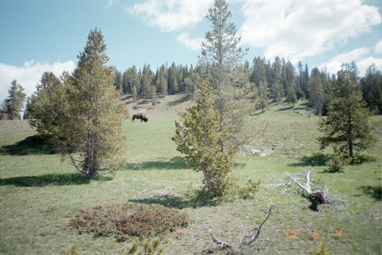 Kurz nach dem Parkeingangerreichen wir die Passhöhe bei 8530 ft. Die Seen in unmittelbarer Nähe sind noch teilweise zugefroren, umgeben von Schneefeldern. Trotzdem haben die Berge hier keinen Hochgebirgscharakter, ausgedehnte Wälder säumen die Straße bis zum Yellowstone Lake.