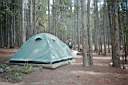Der angefahrende Campingplatz ist groß, aber tatsächlich schon gut gefüllt. Es geht alles sehr geordnet zu, an der Anmeldung wird ein Platz zugewiesen. Das ist naturgemäß nicht mehr der allerschönste, ziemlich nahe an der comfort station und der Erschließungstraße. Der Nachbarplatz wird nicht vergeben, er ist noch weitgehend schneebedeckt. Wir stellen das Zelt wie vorgeschrieben auf dem pad (eine Art Sandkasten)