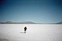 Da der Zeltabbau entfällt, kommen wir recht zeitig los und bei sehr wenig verkehr auch gut voran. Zunächst fahren wir am Südufer des Great Salt Lake entlang. Es gibt einen großen Bootshafen, aber auch ausgedehnte Anlagen zur Salzgewinnung. Das waren aber die letzten Fixpunkte für die Augen, wir erreichen die Great Salt Lake Desert. Rechts und links flache Salzwüste mit einzelnen kümmerlichen Büschen, immer wieder mit großen weißen Flächen durchsetzt, die Autobahn auf 50 Meilen schnurgerade. Vor uns eine Bergkette, die aber nur zögernd näher kommt, obwohl wir die cruise control auf gut 75 mph eingestellt haben. Schließlich ist es rechts und links nur noch weiß und wir kommen zu dem Parkplatz, der mit einem Aussichtstürmchen hinüber zur Weltrekordstrecke Bonneville Speedway ausgestattet ist.