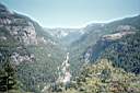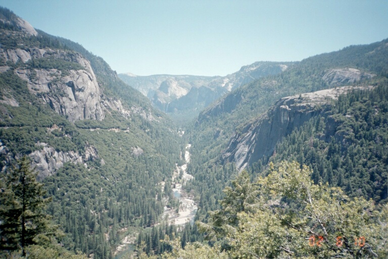 Im Kerngebiet des Parks angekommen, sind wir etwas geschockt von dem herrschenden Trubel und Verkehr. Wir parken deshalb das Auto und besteigen einen der in 10 Minuten Abständen verkehrenden Shuttle-Busse, die auf einem Rundkurs im Talgrund alle points of interest abfahren. Es ist so gedacht, dass man an jedem Punkt aussteigt, die Besichtigung durchführt und mit einem der nächsten Busse weiterfährt. In der Praxis muss man aber selektieren und wichtige Punkte erreicht man doch nicht. Der Talgrund ist bewaldet, so dass nur wenige freie Aussichten möglich sind.