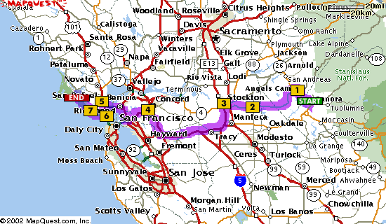 überwunden haben, reisst die Kette der bekannten Ortsnamen nicht mehr ab: Livermore, Walnut Creek, Concord, Berkeley, Oakland. Mit etwas Glück im unübersehbaren Gewirr der Autobahnen erreichen wir die Richmond Bridge (Toll: $2) und können über die Bay hinweg einen ersten Blick nach San Francisco werfen.