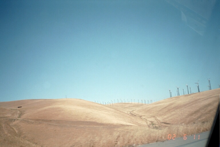 Gleich um die Ecke ist eine Auffahrt auf I5S, die wir also nicht extra suchen müssen. Und schon sind wir auf der Hauptverkehrsader Kaliforniens. Auf vier oder fünf Spuren geht es südwärts. Aber nur für etwa 10 Meilen, dann müssen wir auf I205W in Richtung Oakland abbiegen. Kurzer Tankstopp in Tracy, ehe wir uns wieder in den immer dichter werdenden Verkehr stürzen. Wir erreichen I580W und nachdem wir die Coastal Range mit ihren tausenden Windrädern
