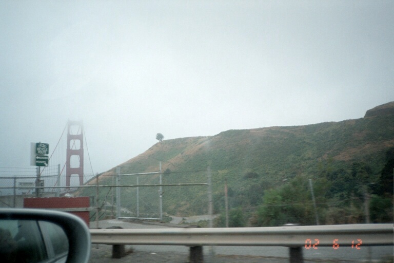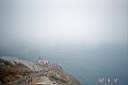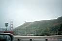 Nun müssen wir nur noch um einen Bergvorsprung herum und urplötzlich stecken wir im Nebel. Von der Brücke kaum etwas zu sehen. Das ändert sich auch nicht, als wir zur Brückenbastion (Battery Spencer) auf der Nordseite hochfahren. Hier kommt noch ein stürmischer Wind dazu, der aber nur immer neue Nebelschwaden vom Ozean herantreibt.
